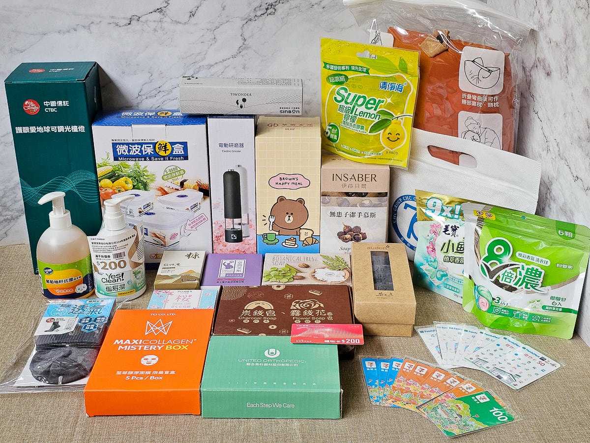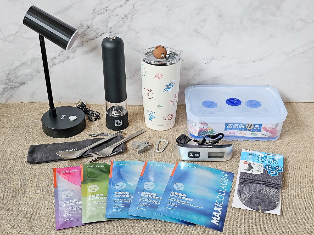 這次領了超多紀念品,來看看我的股東紀念品領取懶人包,有王品禮券、7-11禮券、全家禮券、華南金LINE聯名杯、中信金護眼檯燈、台泥蓋毯、凱基金電動研磨器、嘉泥尼龍三用包、洗衣球、洗手乳、香皂、電子行李秤、至尊膠原面膜、茶山房洗手串皂、阿瘦襪子、保鮮盒三入組、信邦純鈦餐具,都是很實用的生活小物