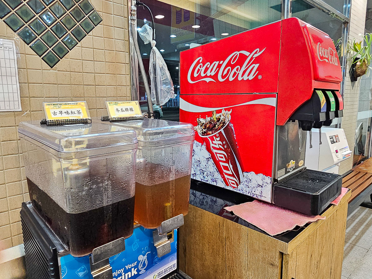 飲料有古早味紅茶、冬瓜檸檬、可樂、雪碧