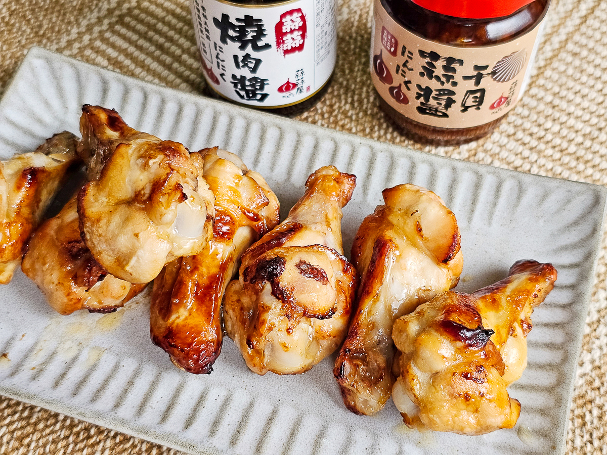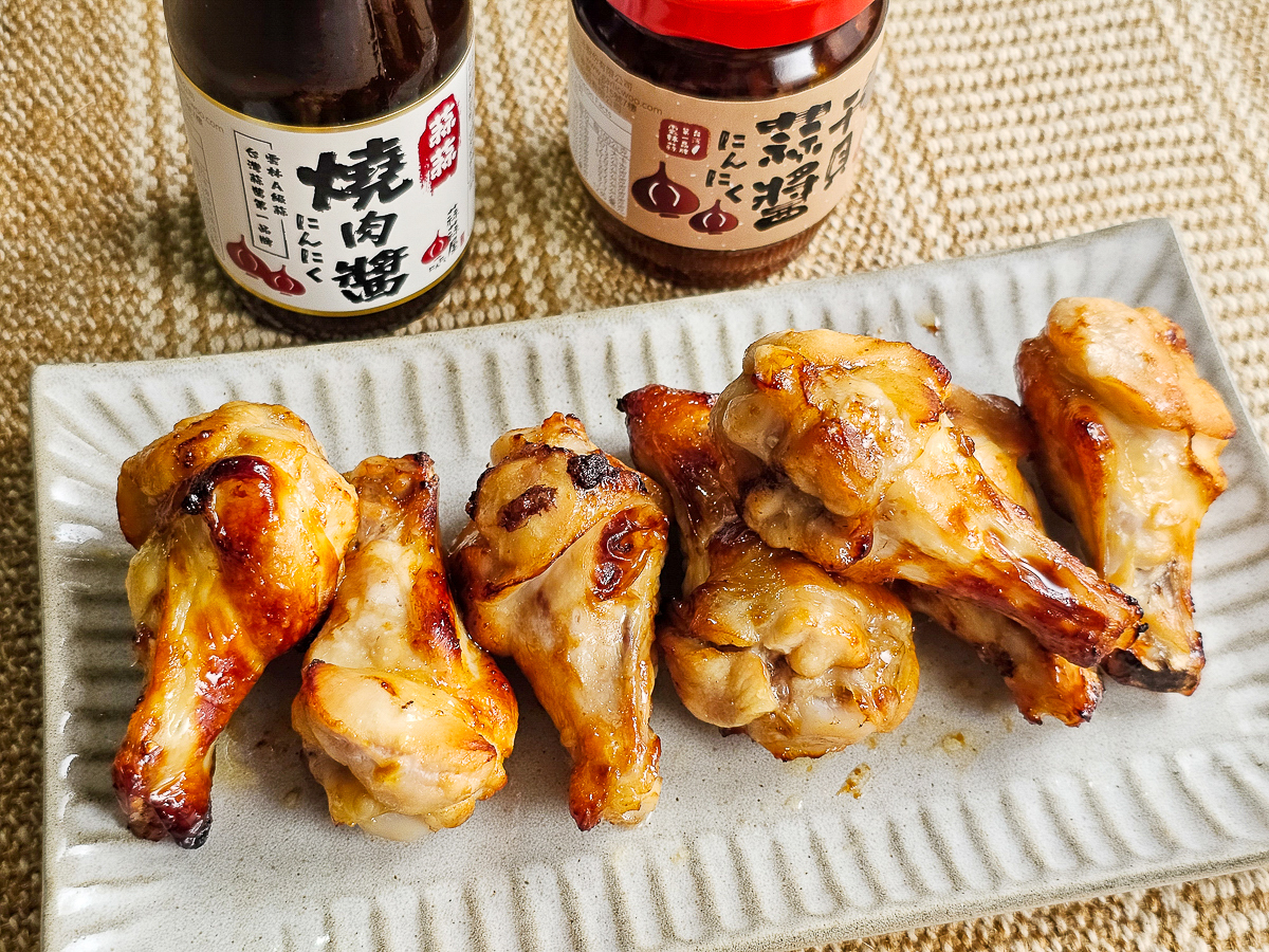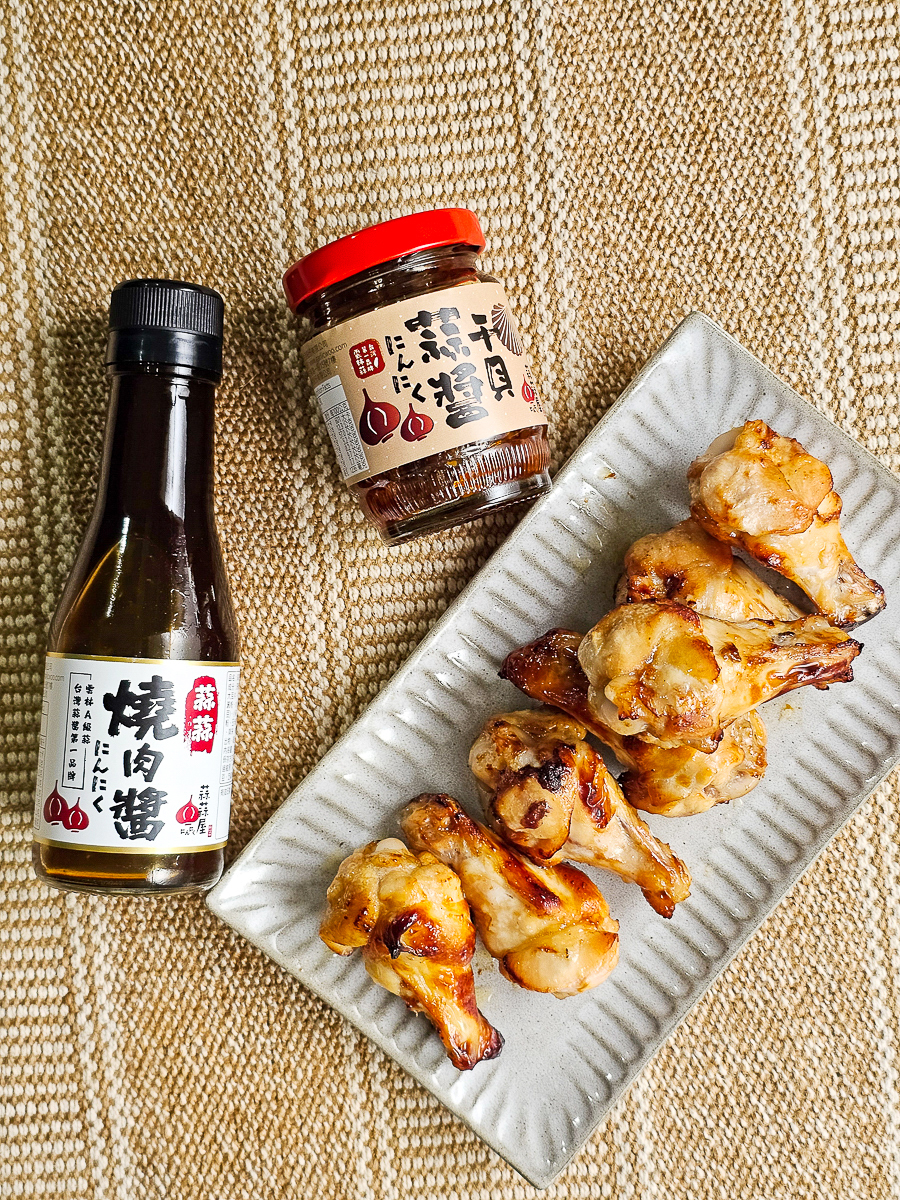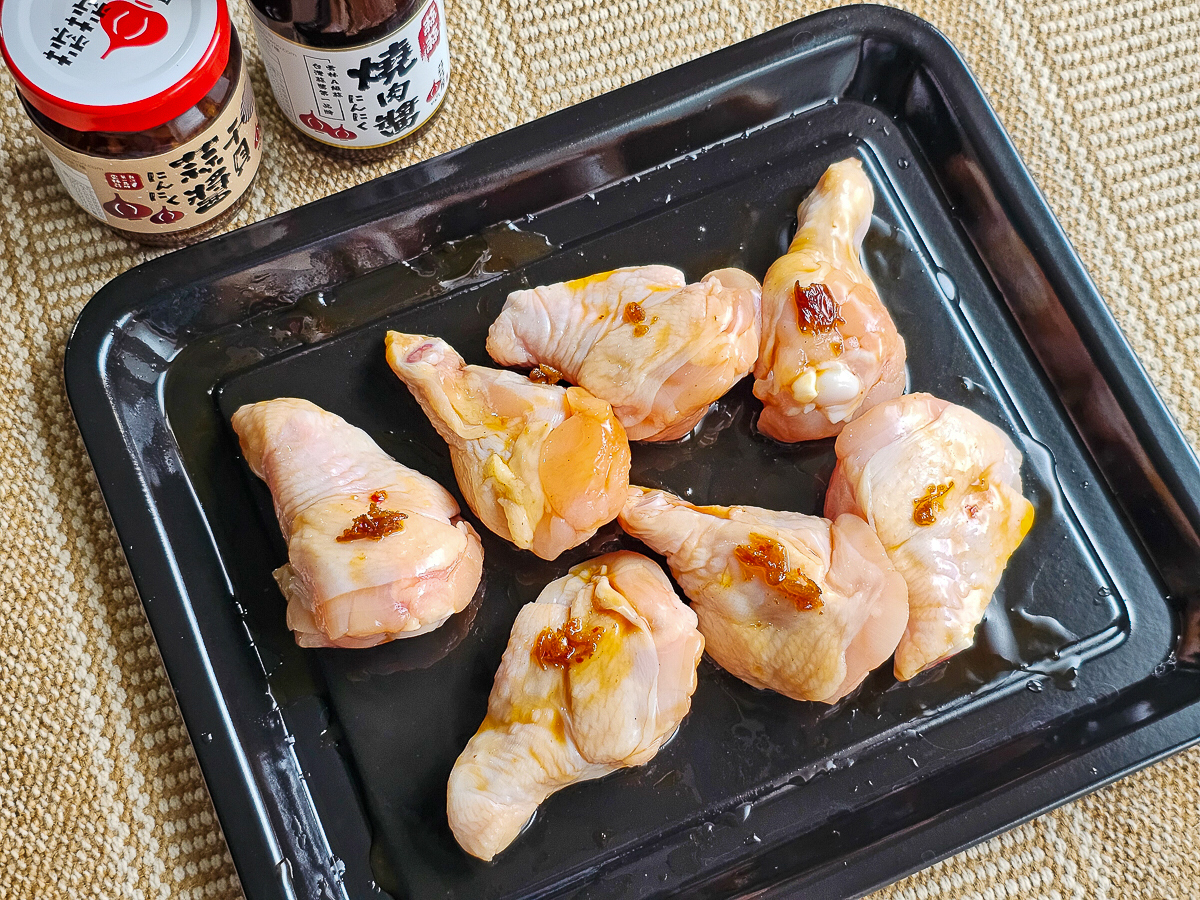 烤小翅腿兩面先均勻刷上燒肉醬,再加上干貝蒜醬提味,整體口感超有層次風味