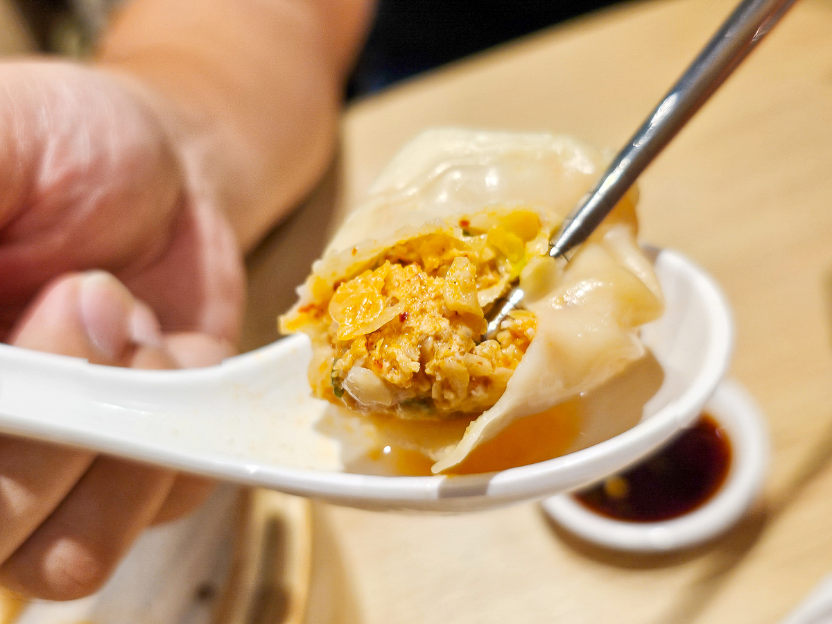 我們不小心點得有點多,因為結完帳才想到有開幕活動消費滿99元,就可以用19元加購高麗菜鮮肉煎餃一份,不吃怎麼可以!所以變成兩盤啦~哈哈