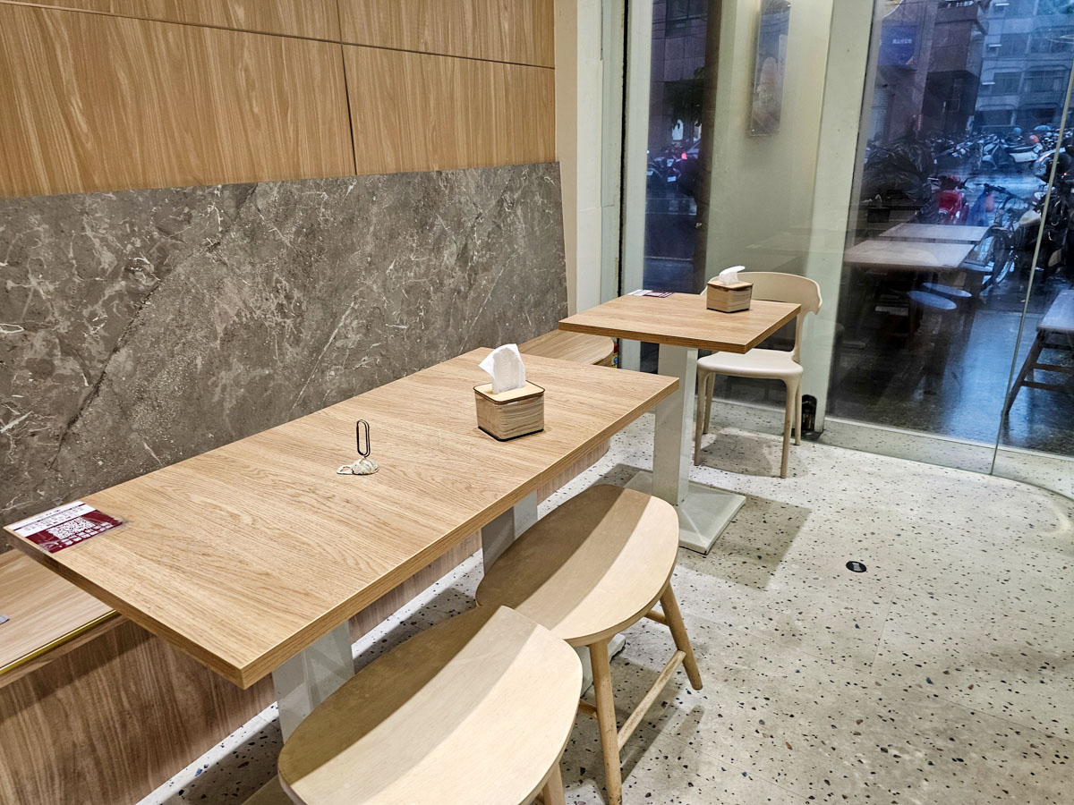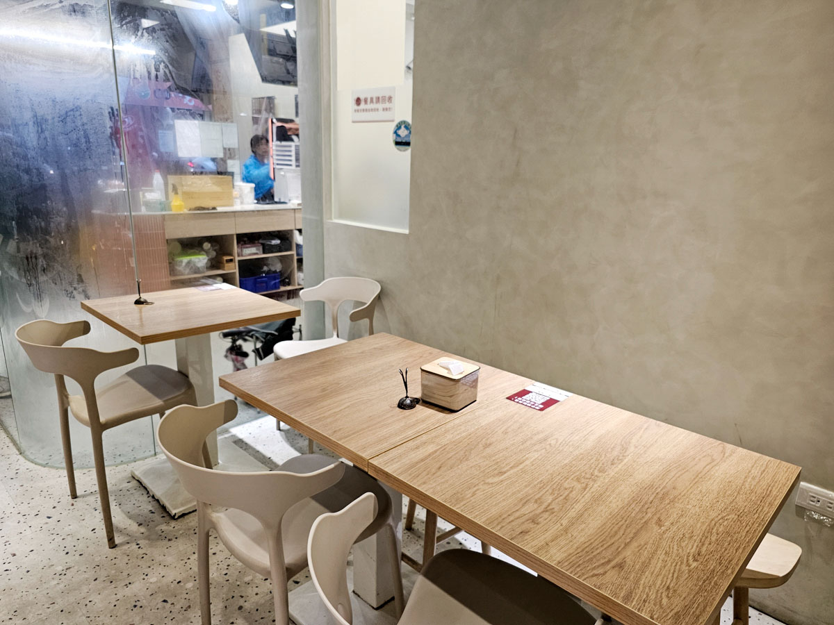 有騎樓跟冷氣內用空間,天氣很熱當然直奔室內吹個涼,因為在對面上課,有注意到每次用餐顛峰時間門口都排很長,這次因為下雨我們就近吃午餐,大雨讓人潮少了許多