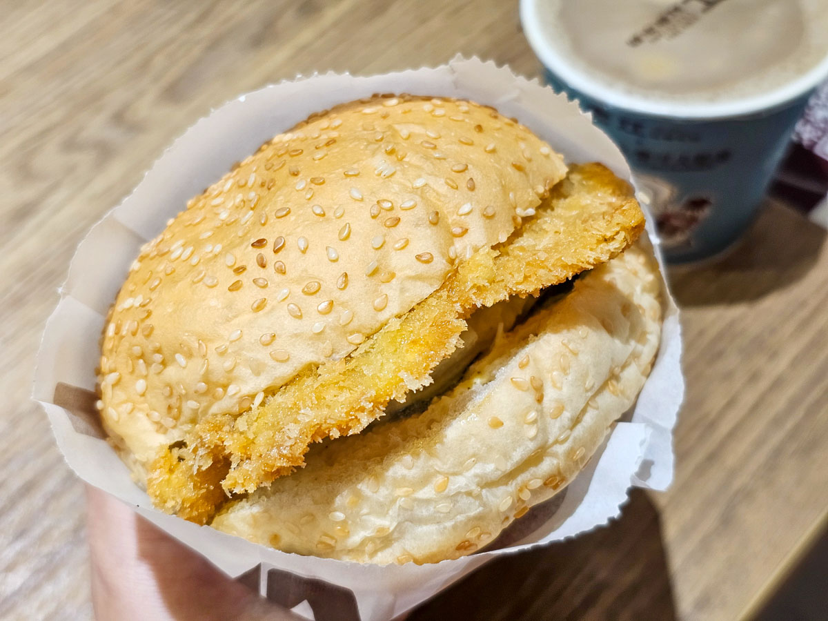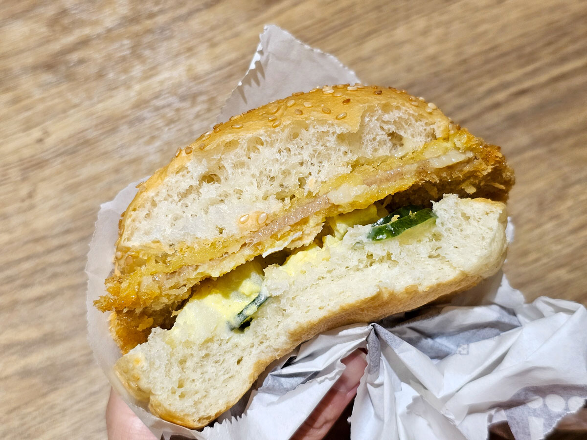 覺得肉排有點小油膩,夾著蛋沙拉+小黃瓜,還好有紅茶牛奶解膩一下