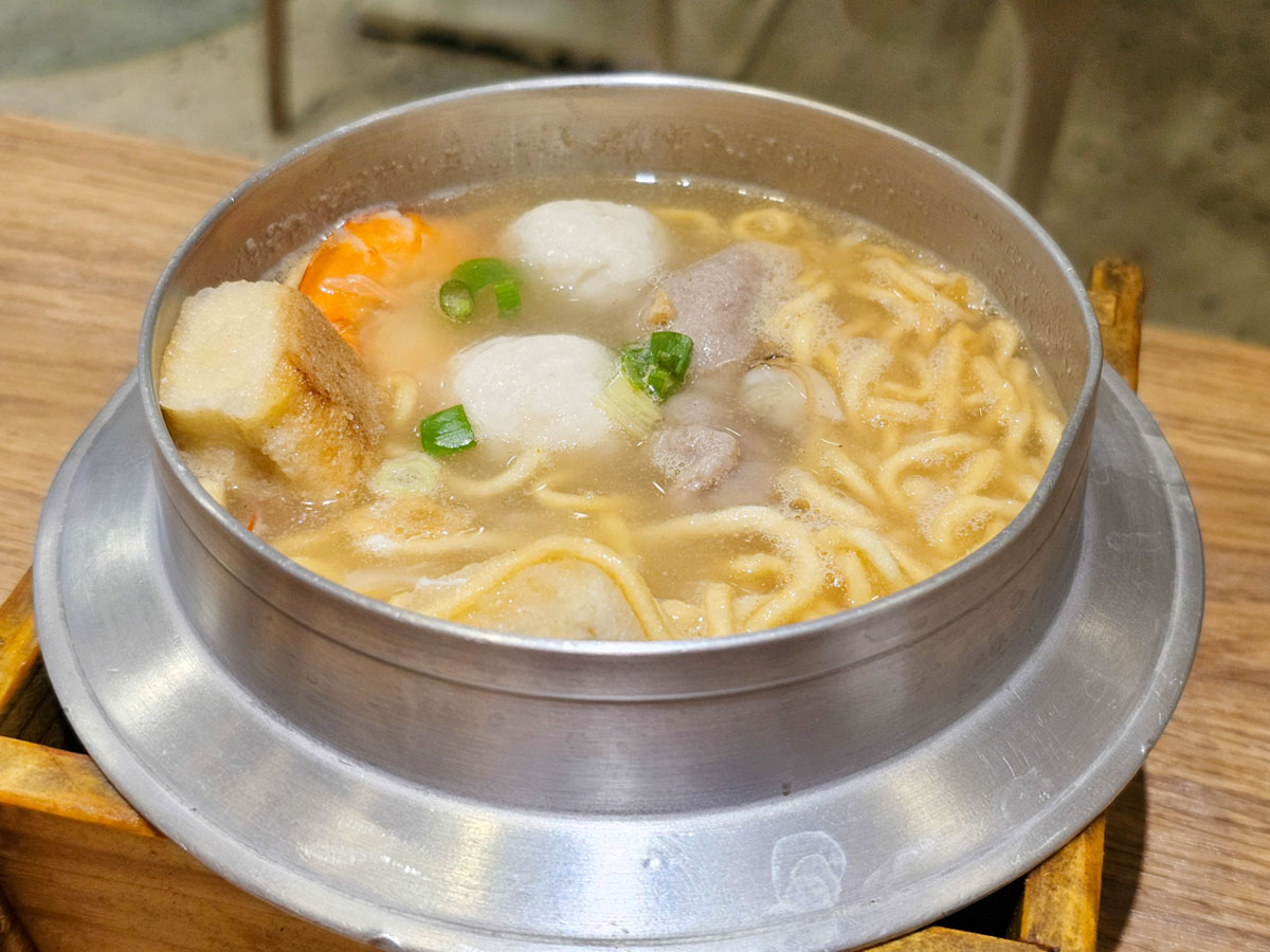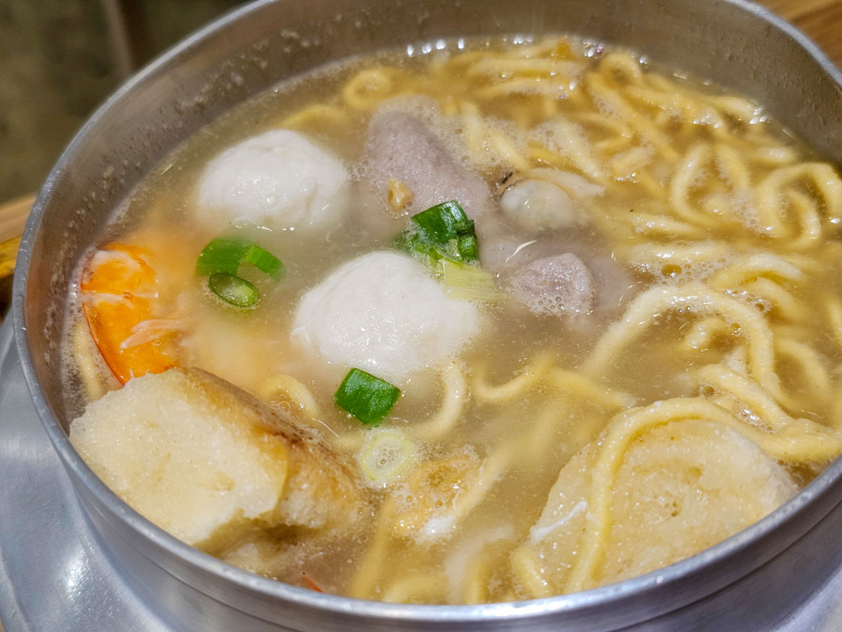 是用懷舊的井字鍋裝,吃起來特別有FU,配料也不少,有鮮蝦、豬肉片、魚丸、蛤蜊等等