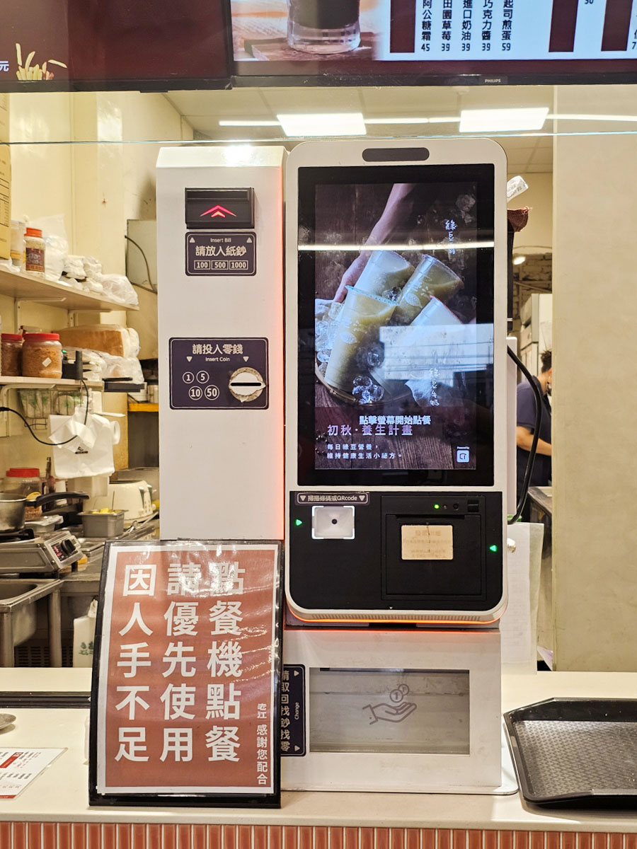 因為人手不足,採用機器優先點餐,也可以用手機掃碼點餐,結帳一律只能現金付款
