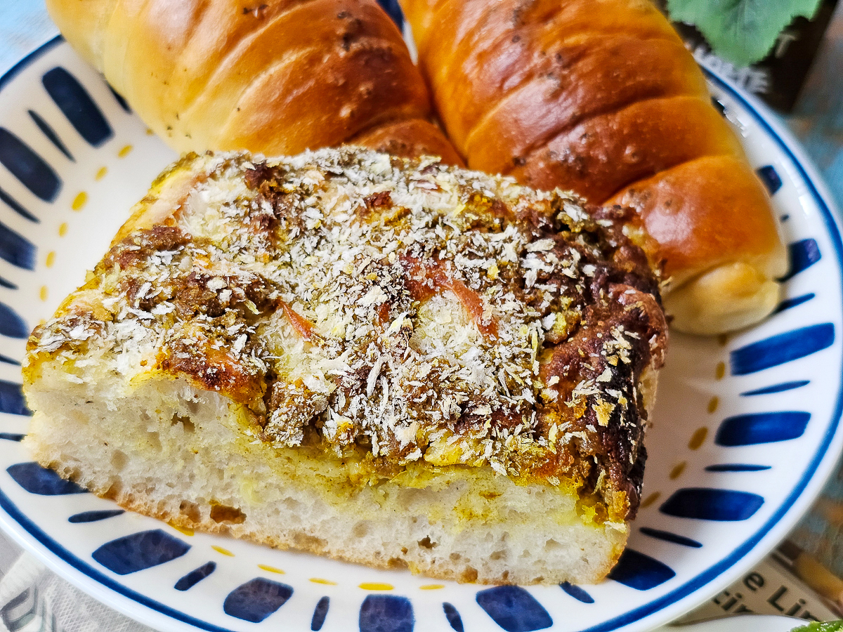 鬆軟Q彈的麵包體裡捲滿義大利黑松露醬,出爐後還刷上松露橄欖油,香氣大爆發