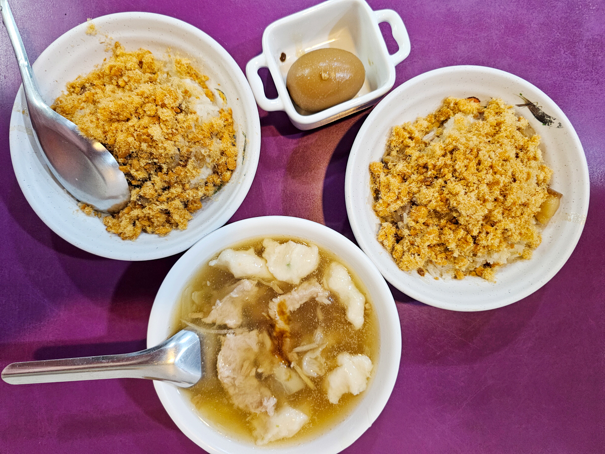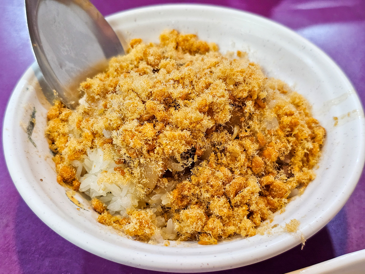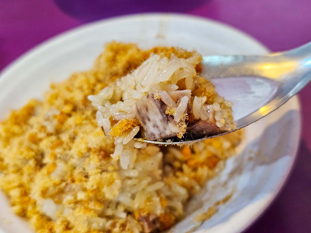 米糕+肉燥滷汁+魚鬆拌一拌,吃起來鹹甜鹹甜的,香氣很濃郁,而且裡面還有小芋頭塊好驚豔!