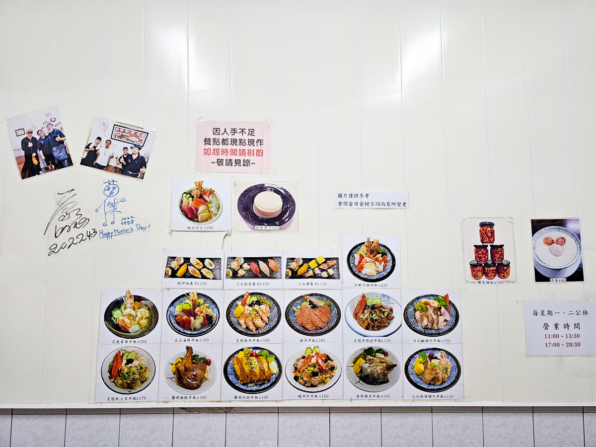有丼飯、生魚片、握壽司、手捲、鍋燒,單價很親民,最便宜的紫菜湯只要10元