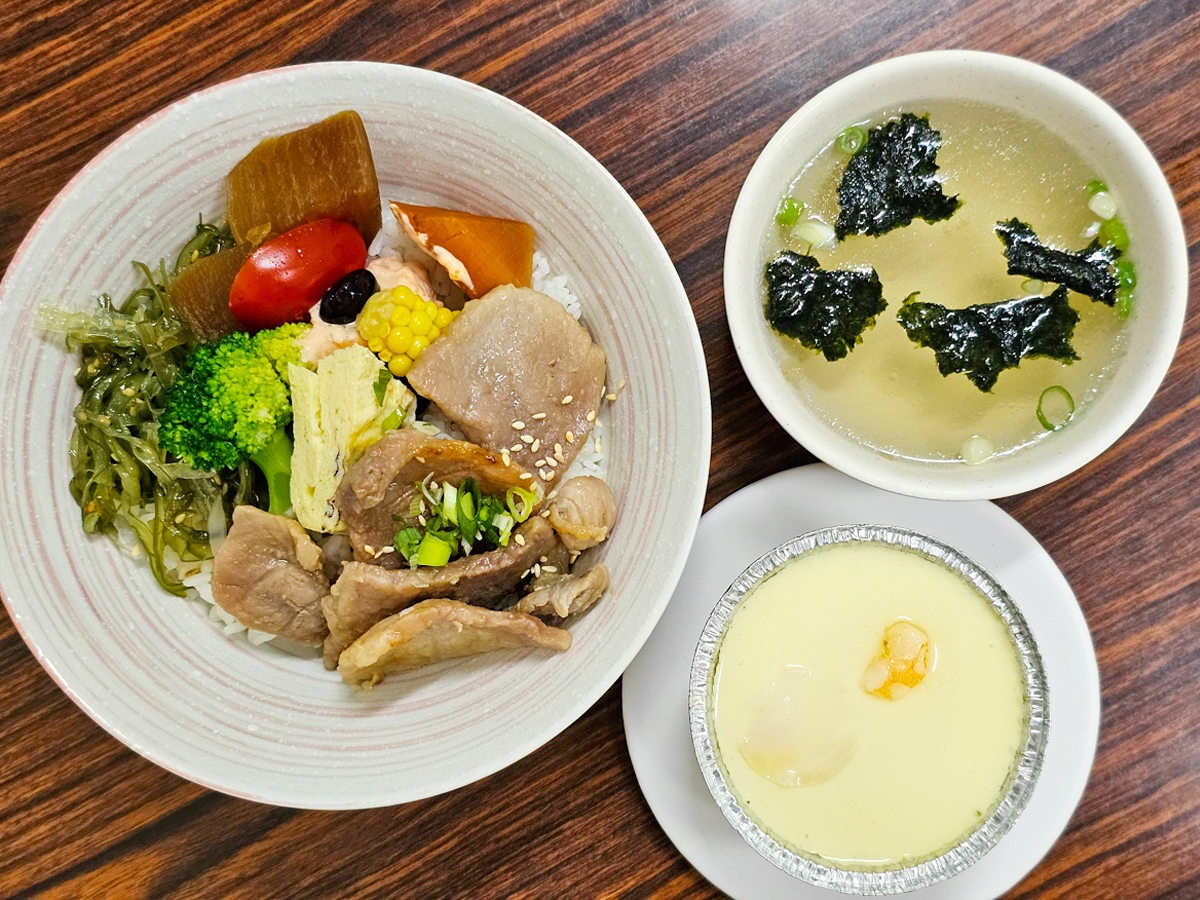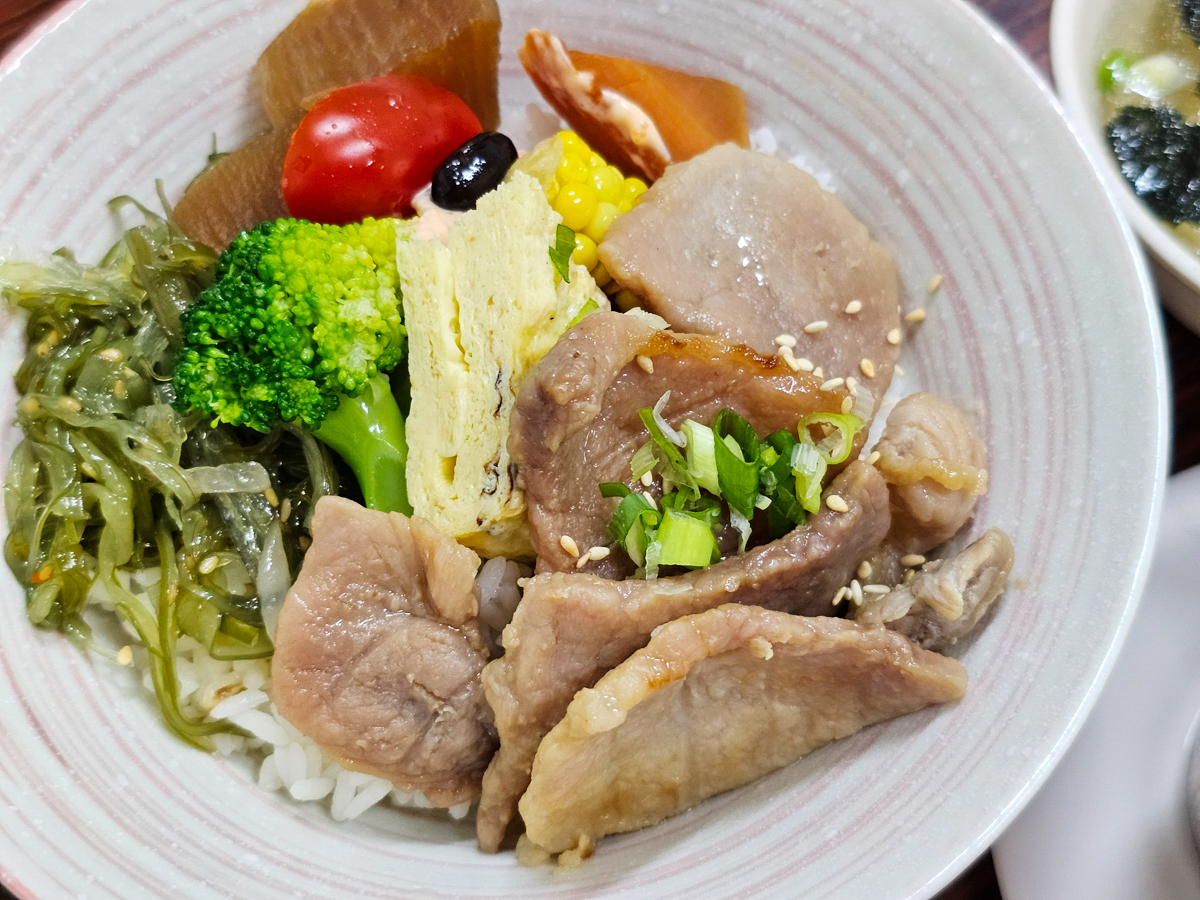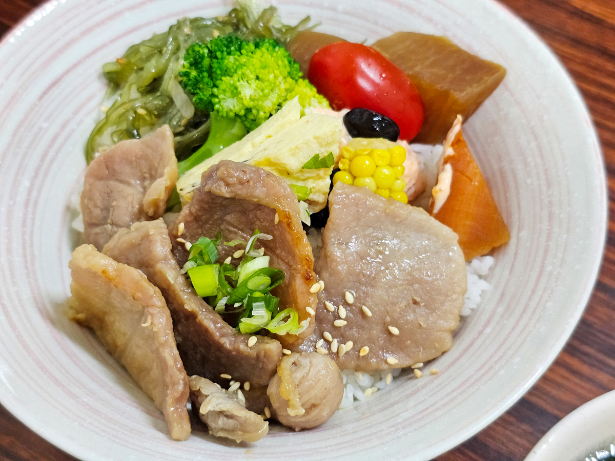 顏色搭配好豐富的一碗丼飯,擺滿了各種小菜,有小番茄、玉米、蘿蔔、玉子燒、花椰菜、涼拌海帶芽,豬肉又厚又大片,M先生吃得很滿意
