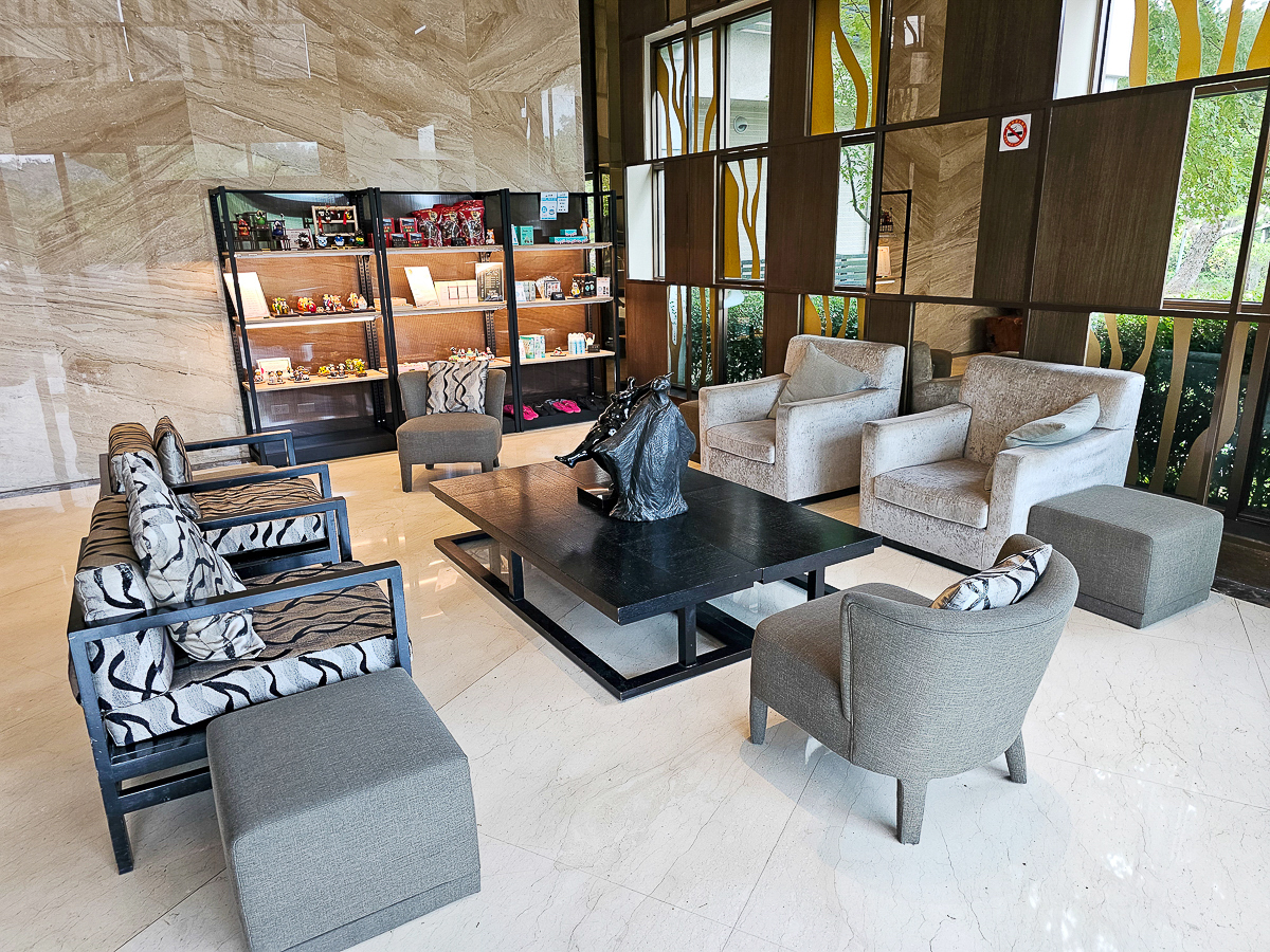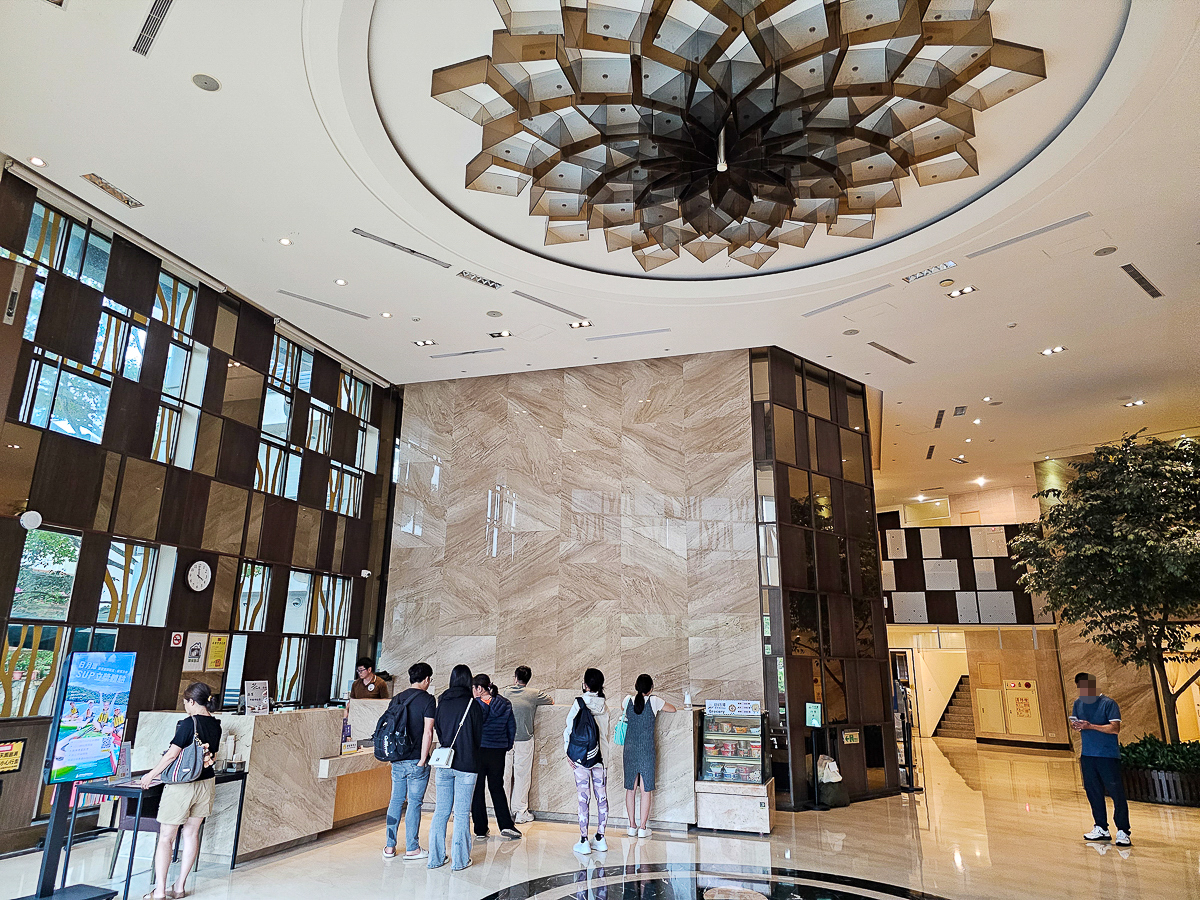 挑高大廳氣派又明亮,check in時還能免費喝迎賓飲料,長輩和小孩都能坐在舒適沙發上休息一下