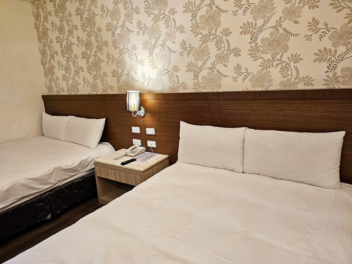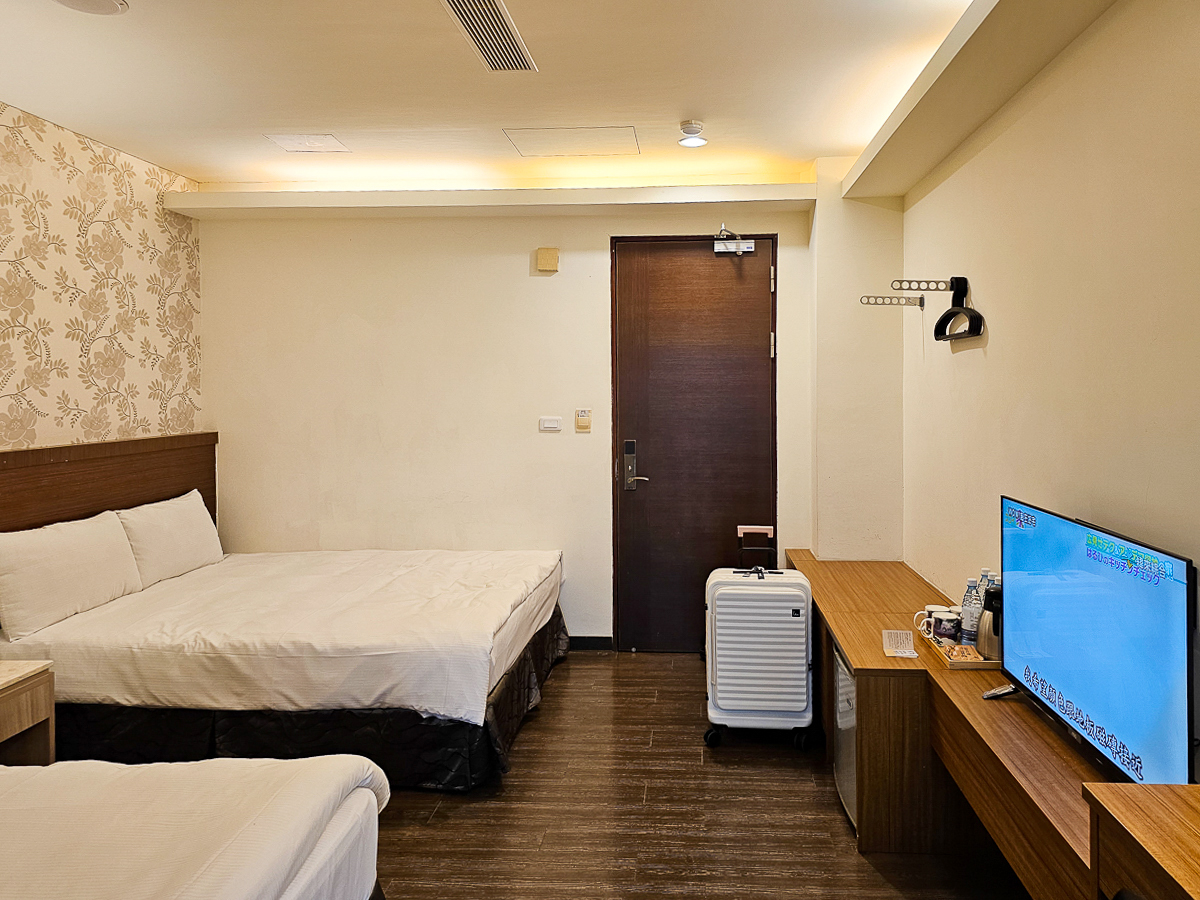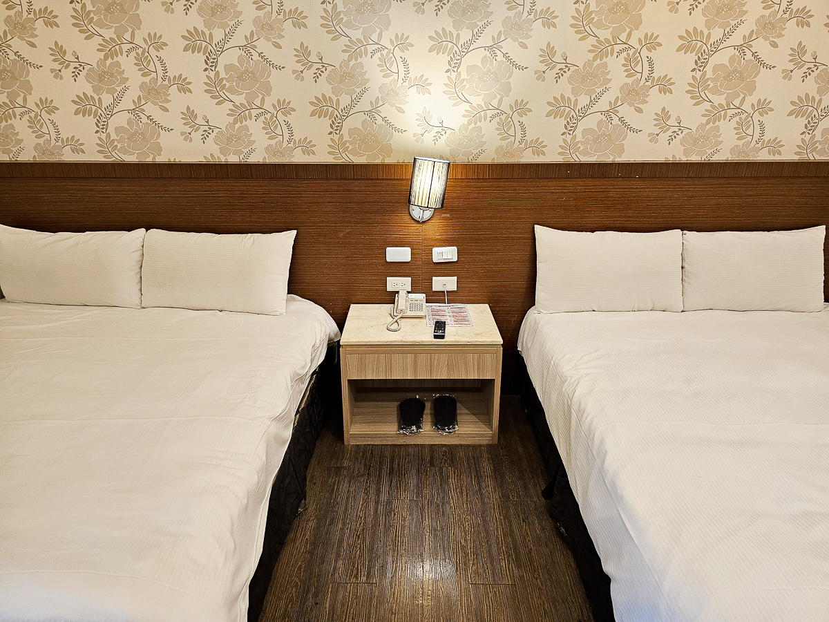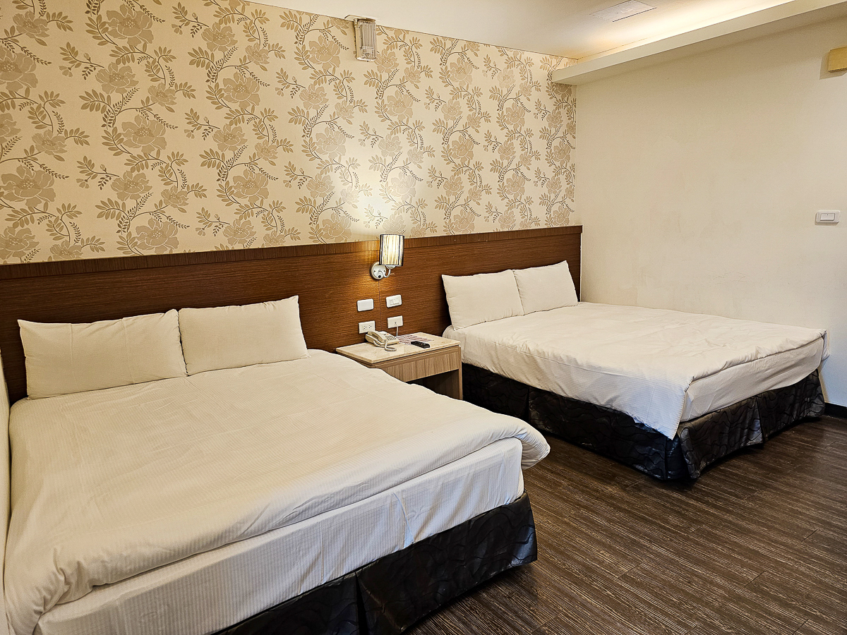 時尚四人套房內有兩張大雙人床,提供兩張磁卡進出,是我喜歡的木質地板