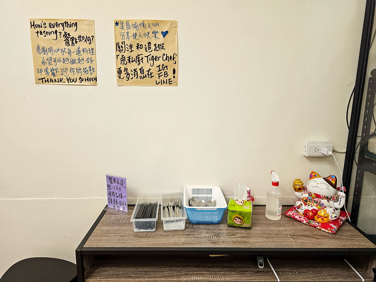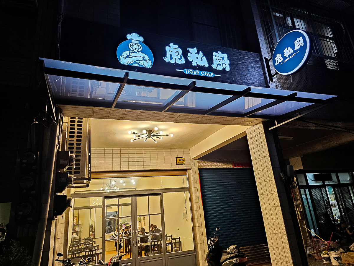 超低調的虎私廚在一整排住家的透天一樓,白天經過真的很容易錯過,晚上點燈後特別的顯眼,結帳只收現金,低消每人一份主餐,建議騎機車來喔~