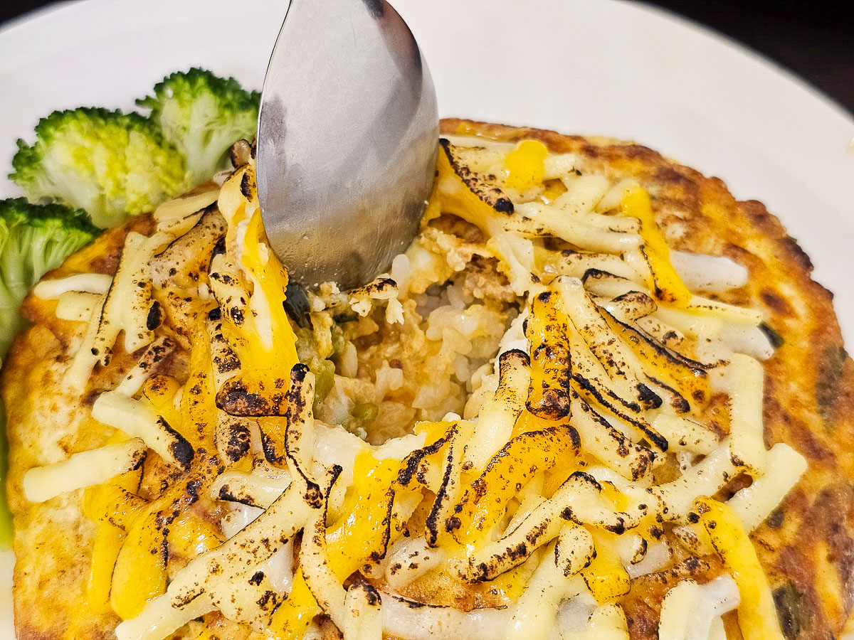 一挖開烘蛋整個香氣四溢,帶有辣度的泰式打拋豬一吃馬上開胃,口感層次超豐富!非常合M先生的口味,5分鐘馬上吃光光,到底是有多餓….