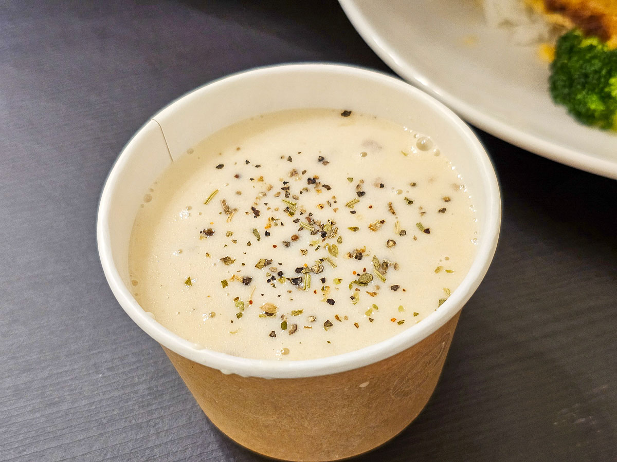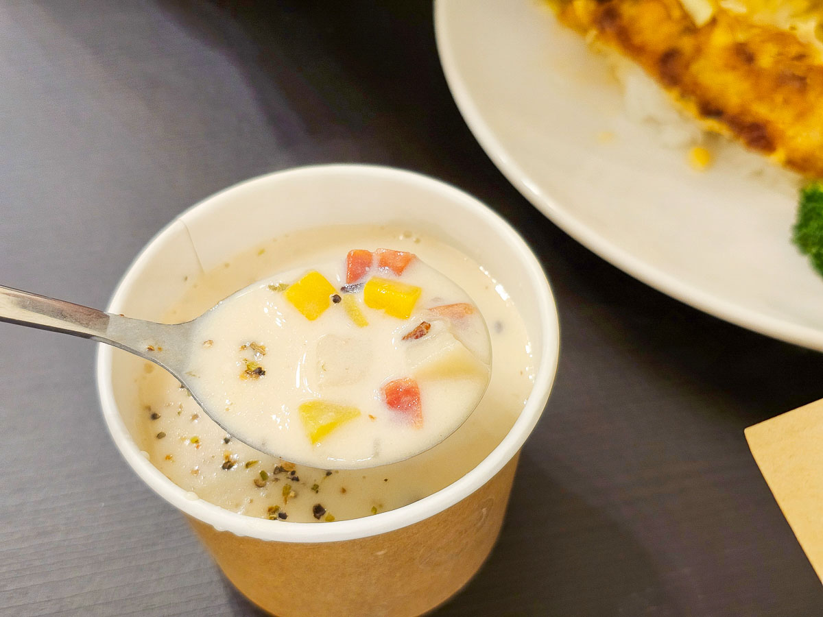 一入口奶香濃郁到不行,綿密細緻非常的好喝,可惜又是用免洗餐具裝,可惜了這麼好喝的濃湯,質感就略遜了一些,或許是老闆沒時間洗碗吧…換成馬克杯或瓷碗馬上有超過50元以上的價值