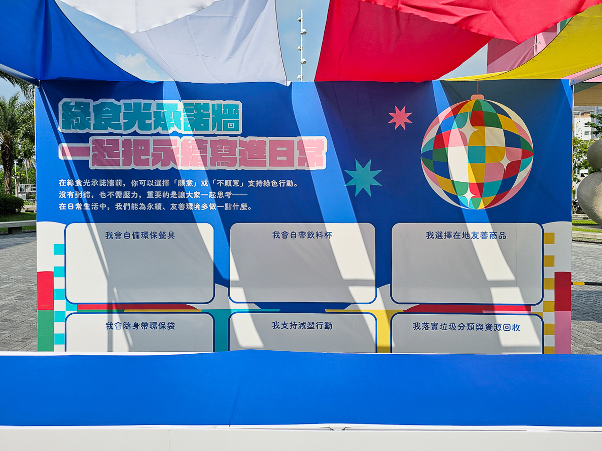 凡於綠食光承諾牆互動區蓋章,並與承諾牆合照即可至黃昏市集服務台兌換透卡一張